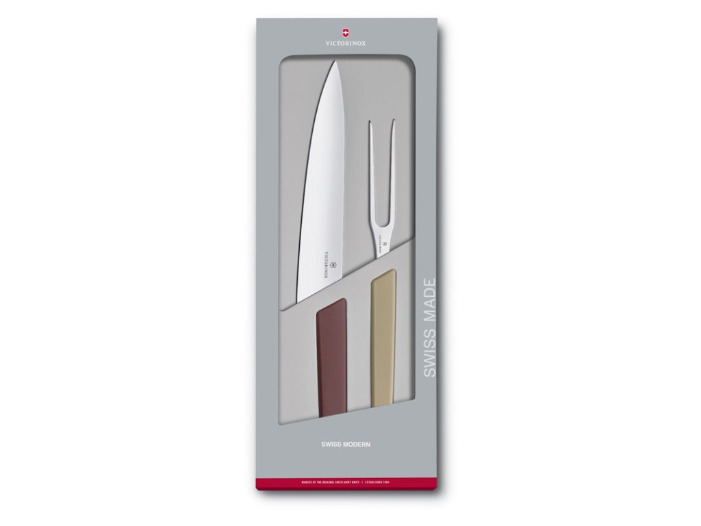 Porcovací sada z kolekce Swiss Modern obsahuje vidličku na maso a kuchyňský nůž.